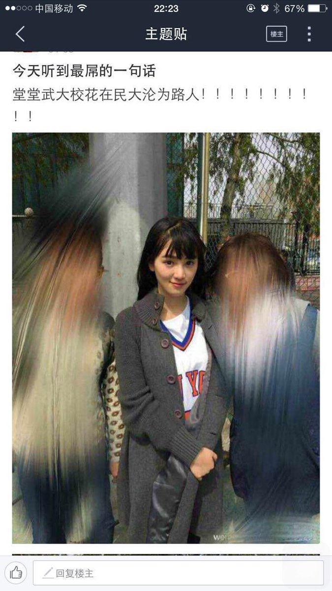 武大也不少比黄好看的。当然,民大质量确实不错,还有隔壁那学校也是 RT @axibiu: 所以说为什么我没男票!民大比黄灿灿好看的有的是好么!掉进人堆里都扒不出来!请让我去理工类学校😭😭