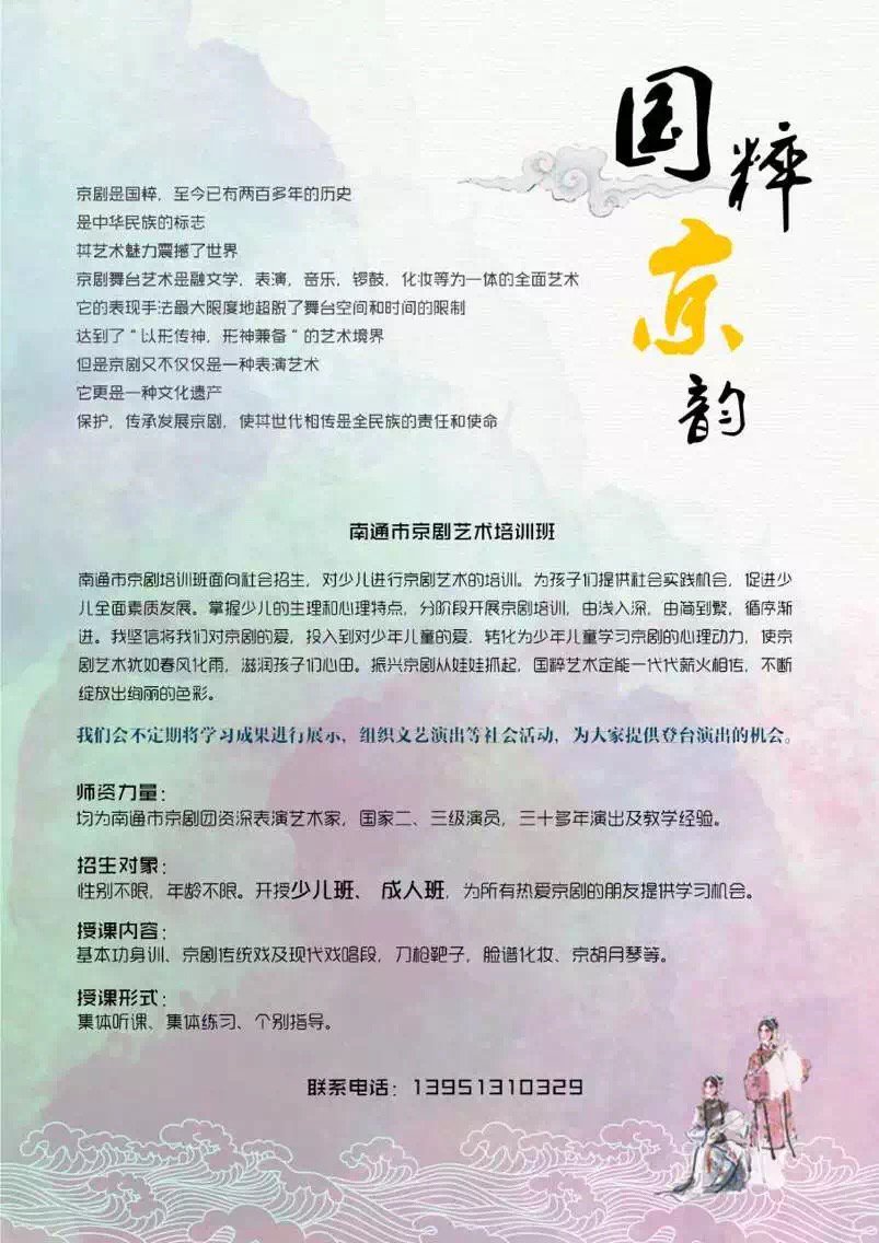 老陈家的广告:爱好京剧的朋友们注意啦,京剧艺术培训班即日开始报名,授课老师均由南通市艺术剧院资深演员担任。联系人:陈老师。