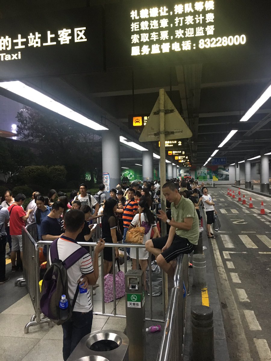 罗湖火车站的士站。亮点不是乘客和车的比例,而是右边车道上站着这两个黑社会一样的人,他们其实是维持秩序的工作人员……