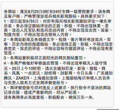 各网站:落实8月23日0时至24时全网一级管控要求,请各网及客户端,严格管理涉阅兵相关新闻跟帖。具体要求如下: