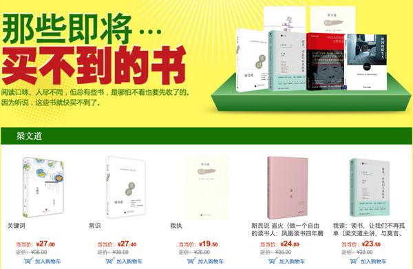 RT @cochinaonline: 新闻出版广电总局下令对余英时、九把刀等作家的书在大陆全面下架,野夫、茅于轼、张千帆、梁文道、许知远等作家的书在大陆不予出版。很快,当当网做了这么一个专题:《那些即将买不到的书》