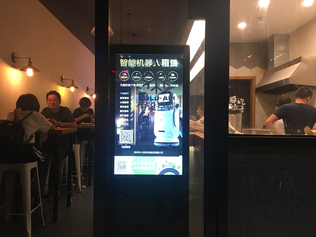 手工饺子店门口的机器人租赁广告。仔细想想这个组合还挺有意思的,就是卡钦斯基说的普通工作都让机器做了,大部分人能找到还算靠谱的工作就只有互相取悦了。